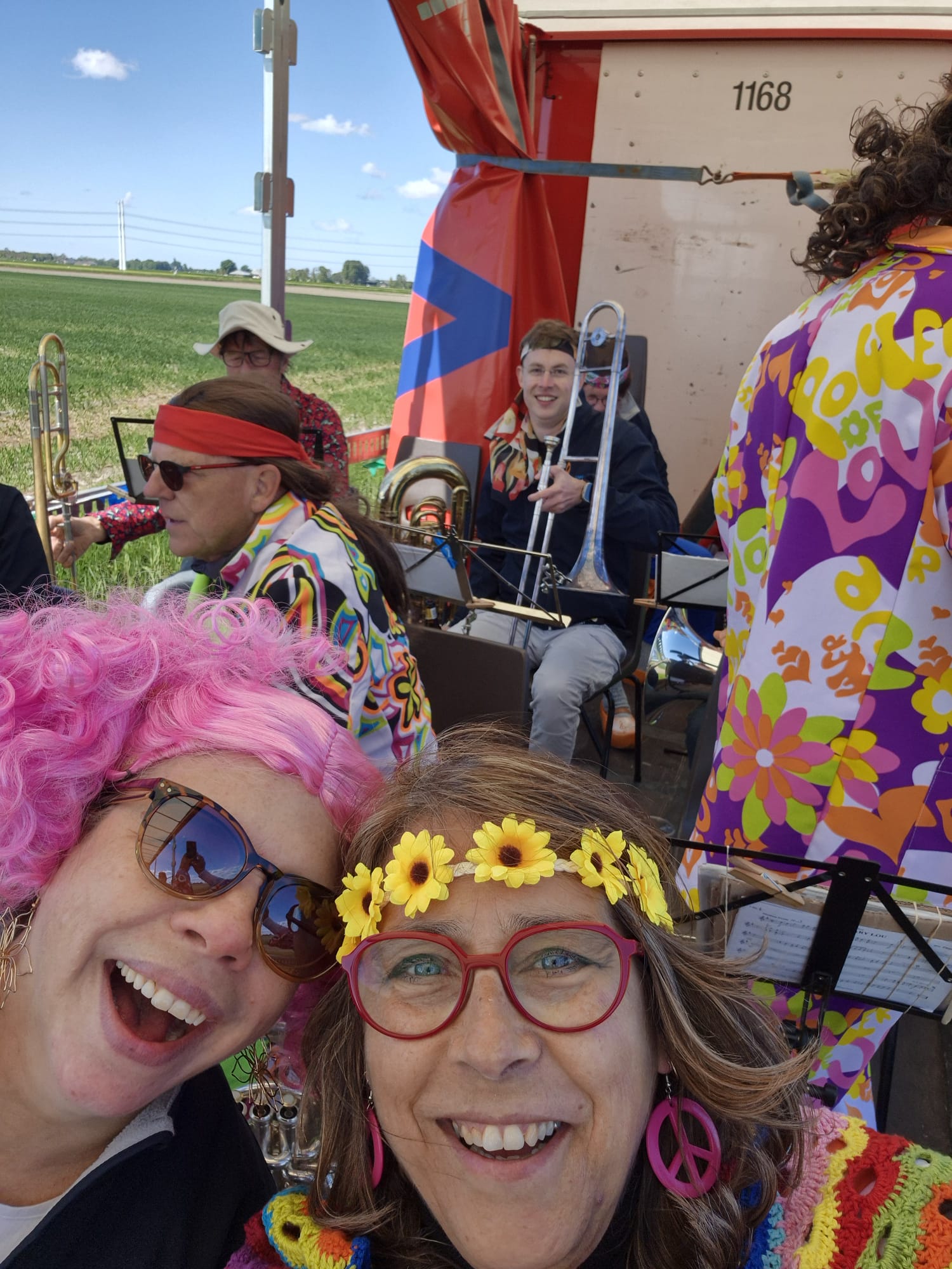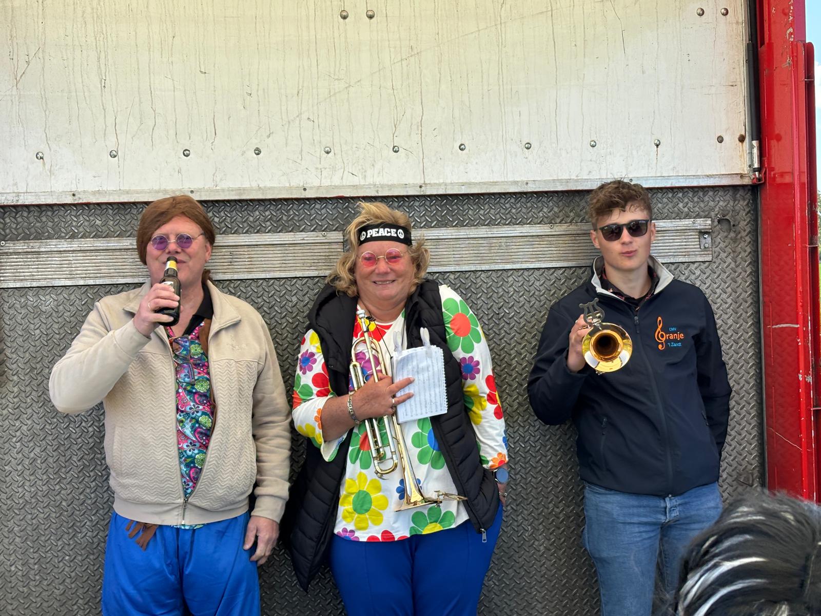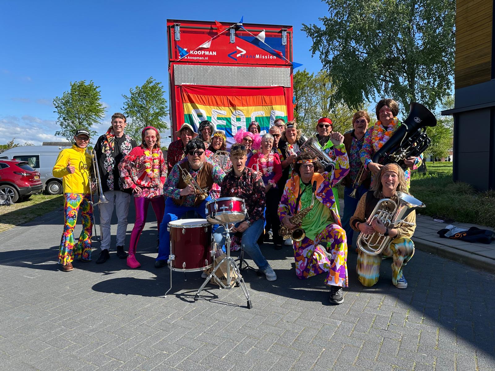 Ons thema was natuurlijk Flower Power! In prachtige jaren '60 en '70 outfits heeft (de helft van) de muziekvereniging hele leuke en vrolijke muziek laten horen.
